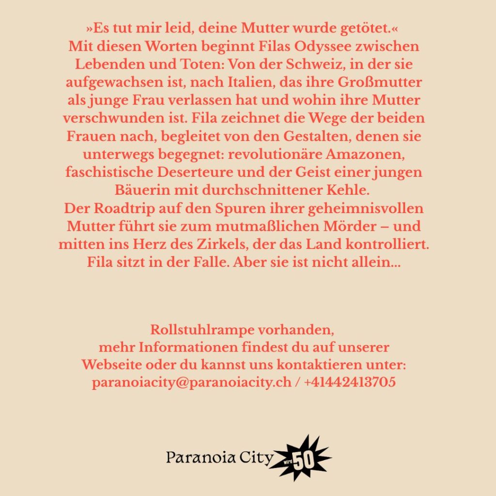 Mit diesen Worten beginnt Filas Odyssee zwischen Lebenden und Toten: Von der Schweiz, in der sie aufgewachsen ist, nach Italien, das ihre Großmutter als junge Frau verlassen hat und wohin ihre Mutter verschwunden ist. Fila zeichnet die Wege der beiden Frauen nach, begleitet von den Gestalten, denen sie unterwegs begegnet: revolutionäre Amazonen, faschistische Deserteure und der Geist einer jungen Bäuerin mit durchschnittener Kehle.